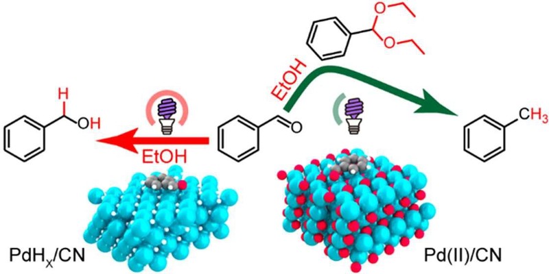 羰基化合物加氢是煤化工、生物质转化、制药化学工业中的一种重要精制工艺。钯基催化剂可以实现羰基加氢还原,但需要高温、高压氢气气氛等严苛反应条件。此外,为避免其它不饱和键的过度还原以及官能团破坏,需要对催化剂和反应条件精准调控实现高选择性转化。异相光催化可以利用Au、Pd、Pt等金属助催化剂,将生物质氢载体(醇、酸、胺等)活化产生氢原子,实现温和条件下芳香羰基化合物加氢。以光催化乙醇供氢还原苯甲醛为例,羰基化合物加氢转化有两种路径,分别为芳香醇路径及缩醛路径,且两种途径加氢均为热力学下坡反应。然而,实验发现光催化羰基加氢的最终产物通常是醇(如苯甲醇),很难进一步加氢合成不含氧芳香烃化合物(如甲苯)。而通过路径II生成芳香烃产物却鲜有报道,催化剂调控机制尚不明确。