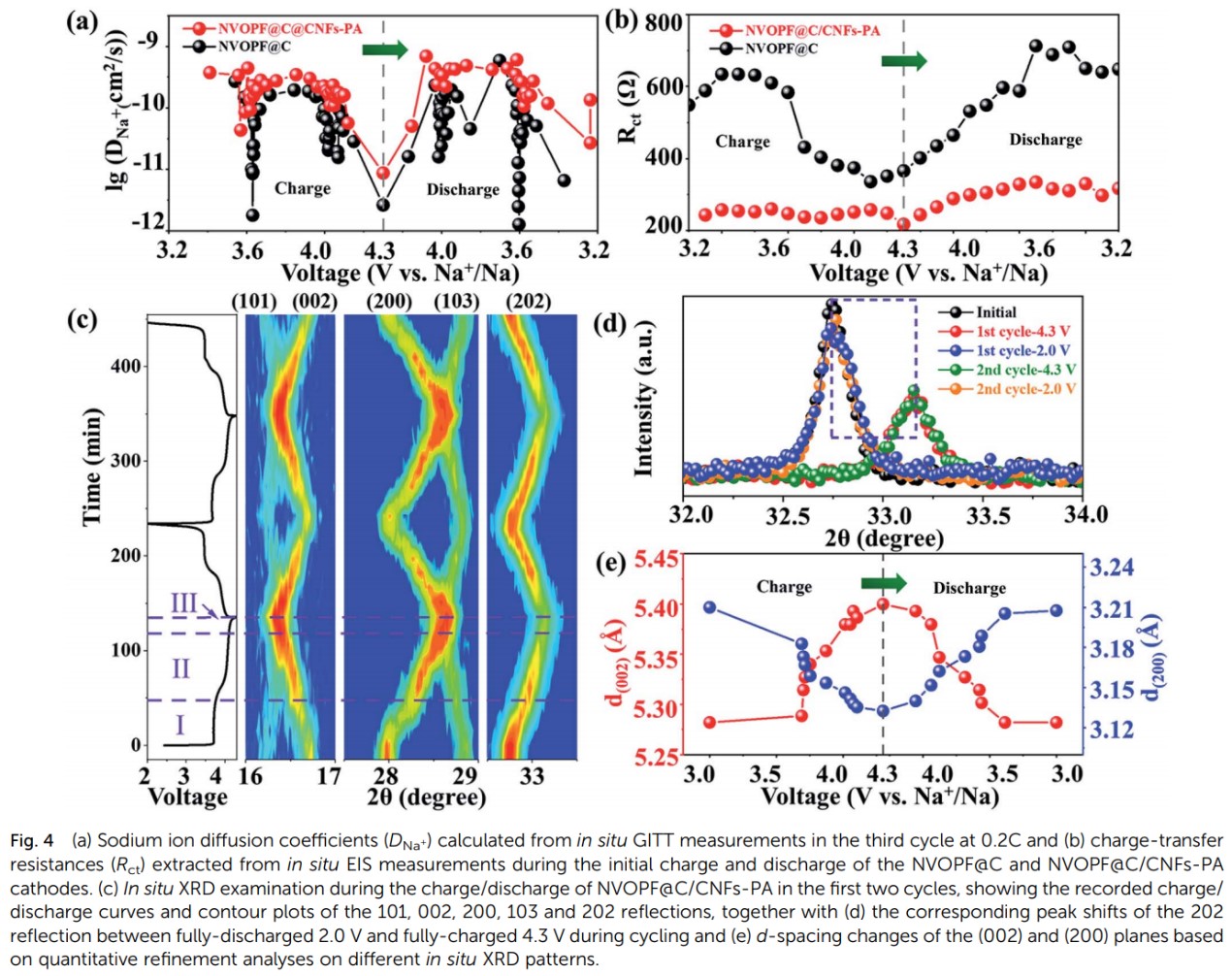 为深入理解双碳修饰对NVOPF基正极材料储钠动力学的影响,采用原位GITT和EIS技术,分别测量了NVOPF@C和NVOPF@C/CNFs-PA首圈充放电过程中的钠离子扩散系数(DNa+)和电荷转移电阻(Rct),如图4a-b所示。NVOPF@C/CNFs-PA的DNa+范围为10-9至10-11 cm2 s-1,平均值约为10-9.5 cm2 s-1,表明在第一个循环中,钠离子快速且稳定地扩散。与 NVOPF@C(550 Ω)相比,NVOPF@C/CNFs-PA电池在OCV状态下显示出更低的Rct值,约为250 Ω,再次验证了CNFs对促进电荷转移的预期效果。总而言之,与NVOPF@C正极相比,CNFs包裹的NVOPF@C/CNFs-PA 在钠离子可逆脱嵌过程中都显示出较低的电荷转移电阻,从而获得了优异的倍率性能和储钠动力学。图4c-e中的原位XRD用于表征NVOPF正极材料在嵌钠/脱钠过程中的相变和结构演变。基于原位GITT、EIS和XRD分析,异质结构的碳涂层和CNFs包裹已被证明可以显著改善NVOPF正极材料的储钠动力学、颗粒表面的电化学稳定性和本体的结构稳定性。