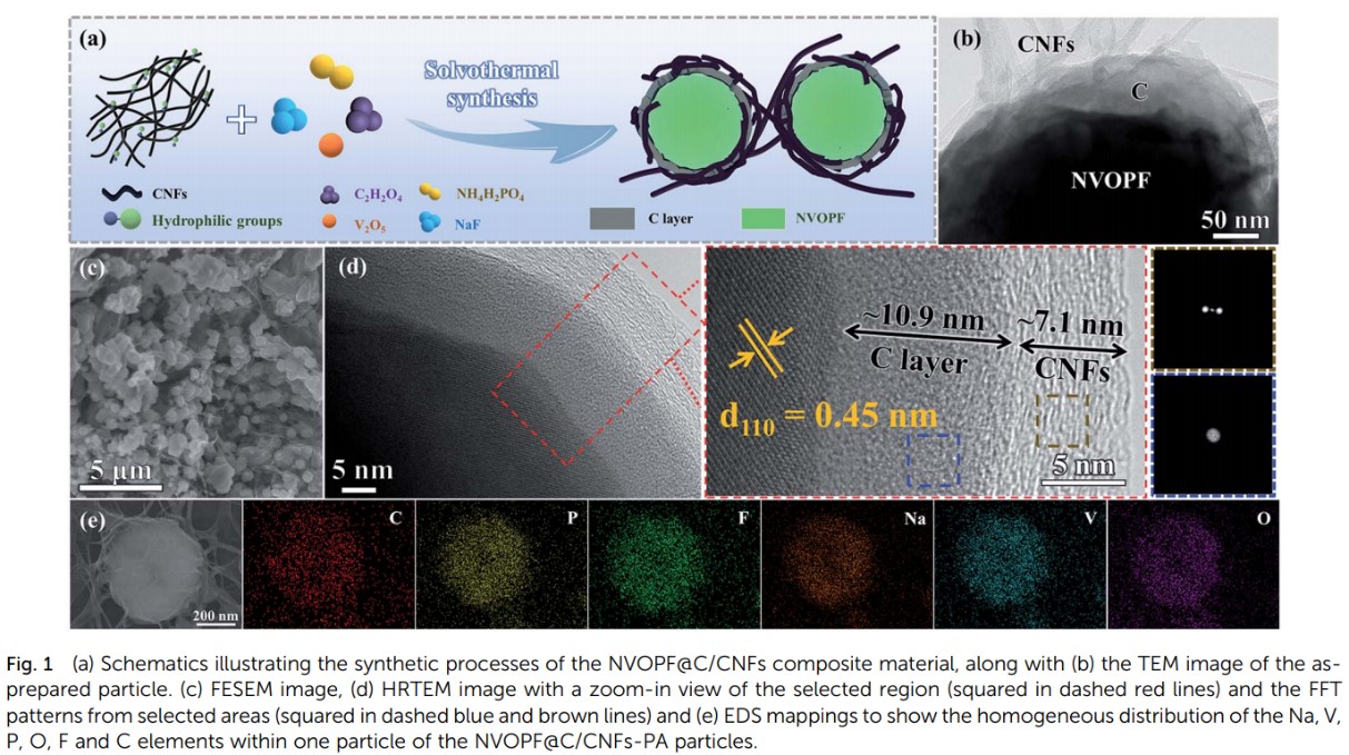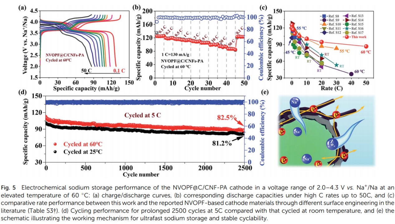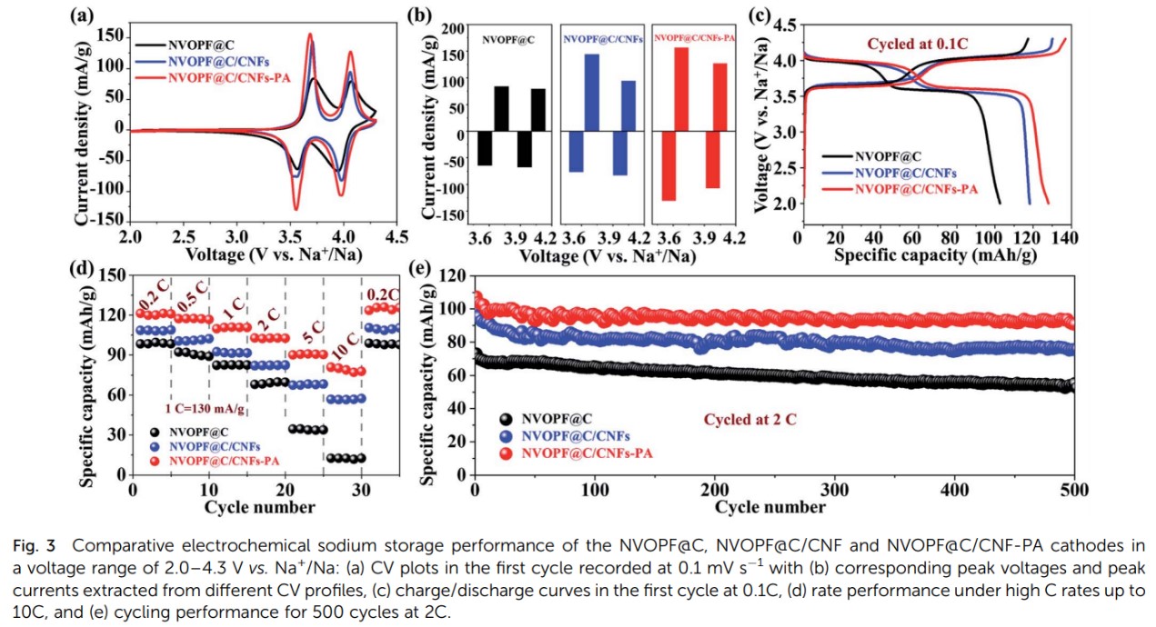 采用简单的溶剂热法,原位制备了双碳修饰的NVOPF@C/CNFs复合材料,其中NVOPF颗粒被无定形碳层包覆,并进一步被高石墨化的CNFs纳米纤维包裹,形成了双碳修饰的异质结构。高导电网络的CNFs组分在桥接NVOPF@C/CNFs颗粒方面起着重要作用。通过后续退火处理,NVOPF@C/CNFs-PA 样品的电子电导率可以进一步提高至~10-2 S cm -1。具有异质结构的双碳修饰有利于改善NVOPF正极材料的倍率和循环性能。NVOPF@C/CNFs-PA正极可以在0.1C条件下提供大约130 mA h g-1的初始放电容量,并且在2C条件下500次循环后,容量保持率高达90%。在高工作温度环境下,双碳修饰提升NVOPF正极材料的超快储钠性能的效应更为显着。在50C和 60°C条件下,NVOPF@C/CNFs-PA 正极具有大于85 mA h g-1的高比容量,并且在5C条件下2500次循环后仍可保持80%以上的容量。此外,异质结构中的双碳修饰克服了3.6 V下钠离子扩散的壁垒,实现了快速稳定的钠离子可逆脱嵌,阐明了NVOPF正极材料超快储钠的具体机制。该项工作提供了一种可行的表面修饰策略,可用于改善聚阴离子型正极材料的高倍率性能。