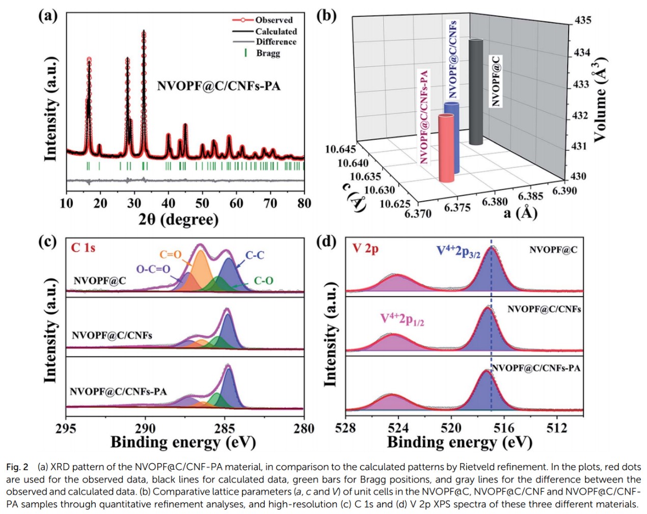 与NVOPF@C相比,NVOPF@C/CNFs通过原位引入CNFs后沿a和c轴的层间距减小,导致其晶体结构的收缩。后续退火工艺导致NVOPF@C/CNFs-PA晶体的进一步收缩,可能是由于内C层的深度碳化,抑制了NVOPF颗粒的生长(图2a)。与NVOPF@C/CNFs相比,NVOPF@C/CNFs-PA显示出 O-C=O和C-O键的强度降低,意味着后续退火增强了C涂层的石墨化程度及材料的电导率(图2b-c)。V 2p XPS光谱还揭示了CNFs的掺入和热处理对V元素的影响(图2d)。