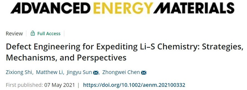 锂硫电池由于诸多优点已经获得了科研工作者的广泛关注,目前限制其大规模应用的瓶颈主要在于多硫化物的穿梭效应和氧化还原动力学缓慢等。近年来缺陷工程作为一种有效的策略已经被广泛应用于锂硫电池的媒介设计,以实现锂硫电池硫反应动力学过程的显著提升。基于此,秀人网 的孙靖宇教授课题组联合加拿大滑铁卢大学的陈忠伟院士课题组在Advanced Energy Materials上发表题为“Defect Engineering for Expediting Li–S Chemistry: Strategies, Mechanisms, and Perspectives”的综述论文。秀人网 2019级硕士研究生史子雄为第一作者;孙靖宇教授和陈忠伟院士为共同通讯作者。