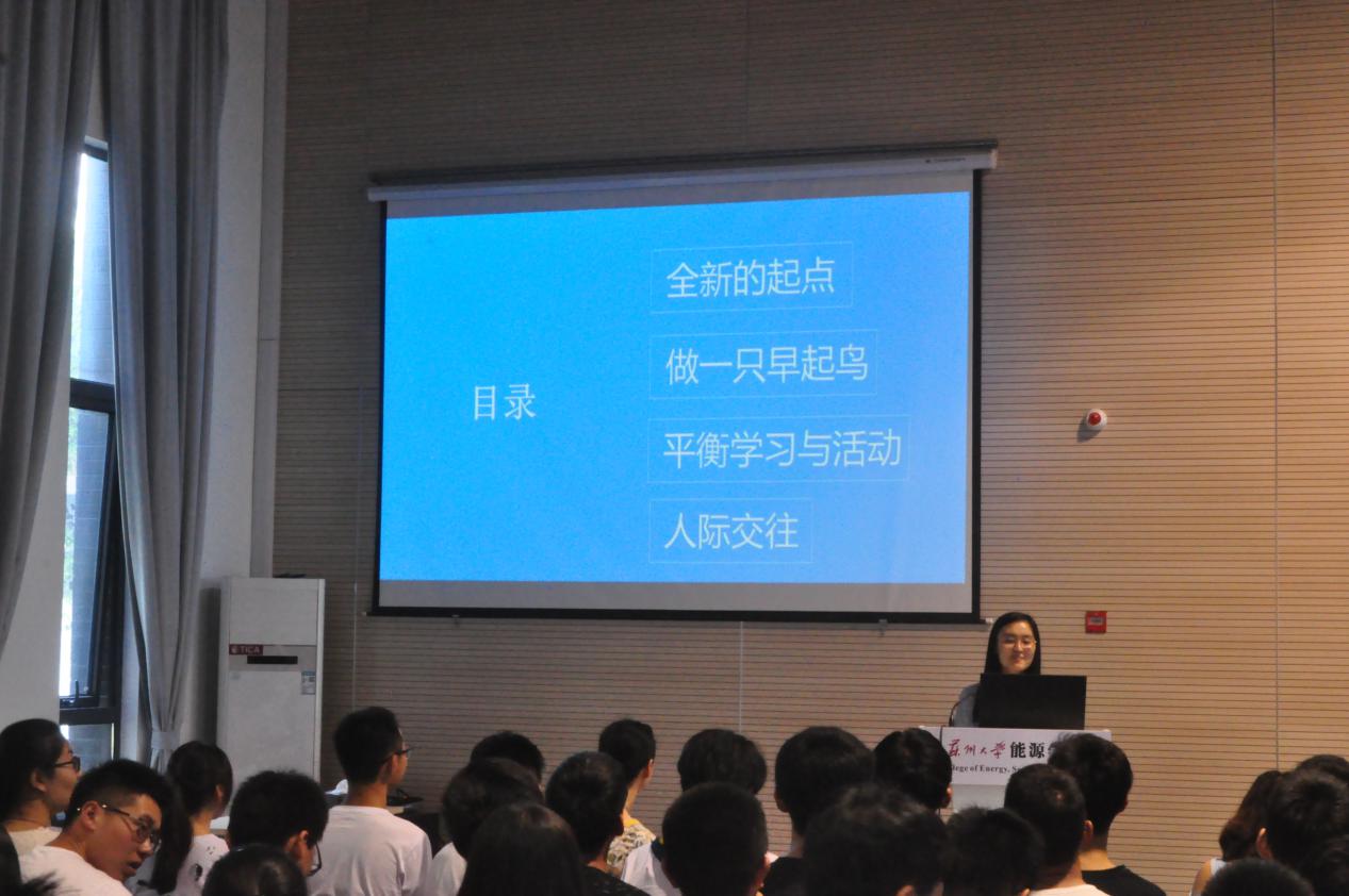 紧接着,15级新中外专业的孙心怡作了演讲,她提到,大学是我们人生的一个全新的起点,我们应该早为我们的人生做打算,做一只早起鸟。她强调同学们维持和谐的人际关系很重要,处理好生活才能更好地学习和工作,师生之间,室友之间,都应和谐相处,不闹矛盾。