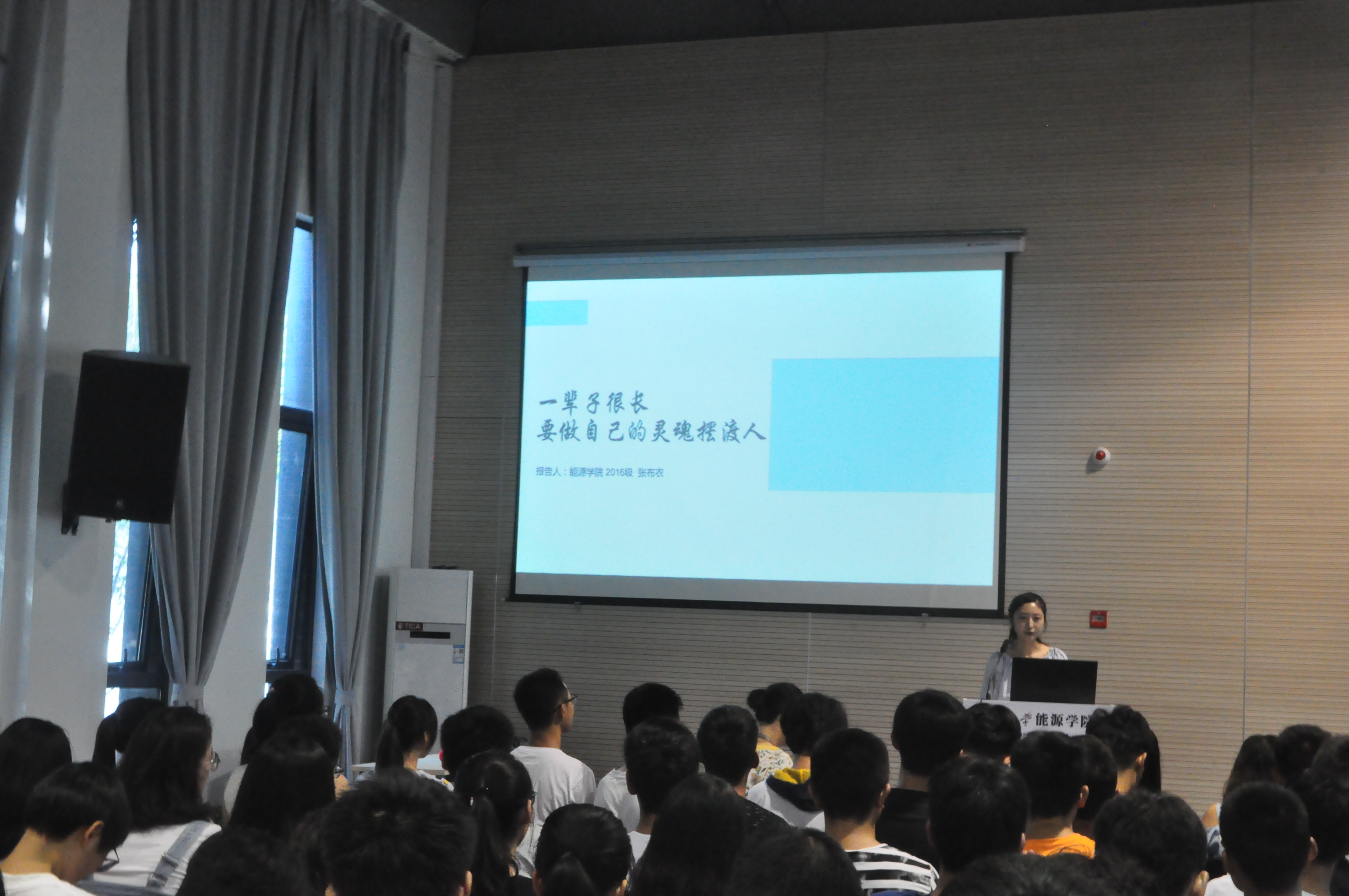 2016级新中外张布衣同学首先发表了主题为“一辈子很长,要做自己的灵魂摆渡人”的演讲。她就自己如何学习,自律自立进行了深刻的阐述,并建议新生们把握好自己的大学时光,为自己的一辈子做打算。