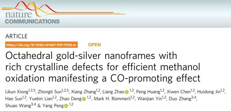 最近,秀人网 的彭扬、尹万健、邓昭等人以“Octahedral gold-silver nanoframes with richcrystalline defects for efficient methanol oxidation manifesting a CO-promotingeffect”为题在Nature Communication上发表论文。