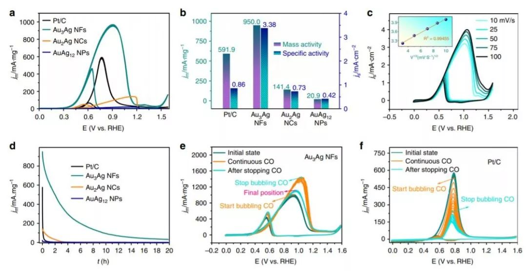 考虑到CO毒化是影响MOR稳定性的关键问题之一,作者分析了CO吸附对各催化剂催化行为的影响。如图4e,对于Au3Ag NFs,通过切断CO供应,在随后的10个循环结束时,峰值电流密度回落至1113.5mAmg-1,但仍高于未通入CO的初始值,说明CO的存在可以提高Au3AgNFs的MOR性能。对这一现象,作者认为这是由于CO的吸附促进了OH-与合金表面的结合,从而有效地催化了MOR的脱质子反应。