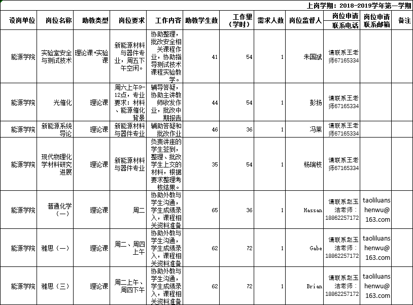 三、聘任流程:应聘博士生对照网上发布的助教岗位信息表在经导师同意后,提交《秀人网 博士生助教岗位申请与聘用表》(附件3)到设岗单位,各位同学必须在10月29日(周一)前联系下面表格中的岗位联系电话和联系老师进行聘任考核并完成岗位聘任,逾期不予聘任。