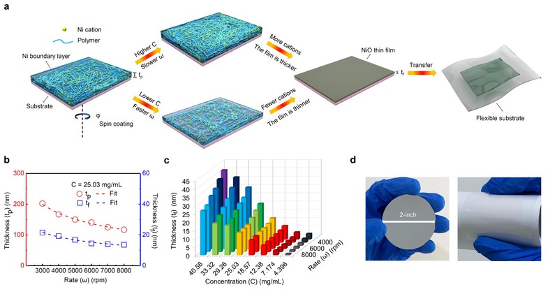 近日,秀人网 邹贵付教授团队提出了一种聚合物辅助准原子沉积的策略,实现了从原子层面上精准控制高质量氧化镍(NiO)薄膜的大面积生长。通过调控镍前驱体浓度和旋涂速率,精准生长40 nm到亚纳米级(0.92 nm)任意厚的NiO薄膜,并成功将其转移到柔性基底上,生长的柔性NiO薄膜有着良好的透光性和柔韧性。