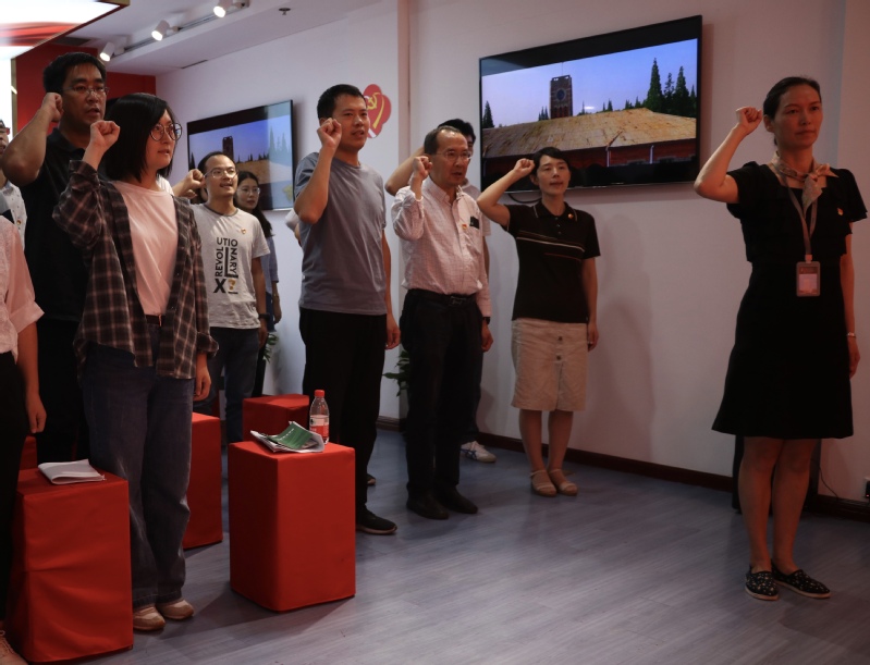 观影后,在学院党委书记沙丹丹的带领下,所有教职工党员眼神坚定面向党旗庄严宣誓。沙书记表示,新时代的共产党员道阻且长,要坚持不忘初心,珍惜这个时代给我们创造的大好环境,铭记并传承东吴先辈们的信仰精神;沙书记还号召全体教职工党员积极发挥教师党员责任担当,牢记“立德树人”的使命,始终勇于走在前列,敢当模范先锋,为新中国成立70周年献礼。