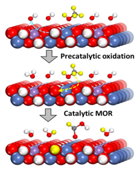 本论文报道了利用原位Raman光谱、H/D同位素效应研究和DFT计算等策略探索了NiM-LDH (M = Fe、Mn)催化剂在甲醇氧化(MOR)制甲酸过程中的结构演化与反应机制,并提出了基于一对催化活性位点(包括NiIII和邻近亲电氧)的协同或双功能催化机理:即NiIII提供反应底物及中间体的吸附位点,邻近亲电氧位点作为氢受体有利于实现反应底物和催化剂之间的氢转移,从而将原位生成的NiIIIOOH还原为NiII(OH)2。与经典的基于单一位点的催化机理相比,该机理可以很好的解释基于NiFe或NiMn-LDH催化剂的自发或非自发的MOR过程,催化剂表面的 NiII/NiIII动态平衡以及高选择性的甲酸生成。因此,该机理的提出将有助于深入理解MOR过程,为先进催化剂的设计提供理论依据。