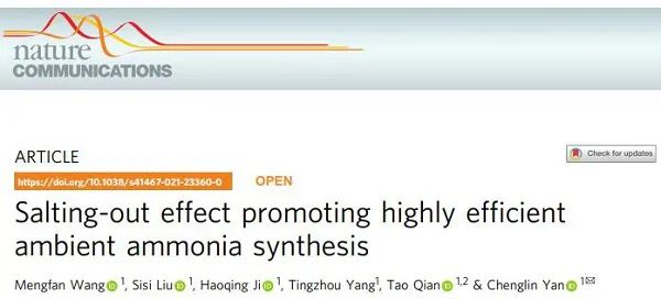 题目:Salting-out effect promoting highly efficient ambient ammonia synthesis