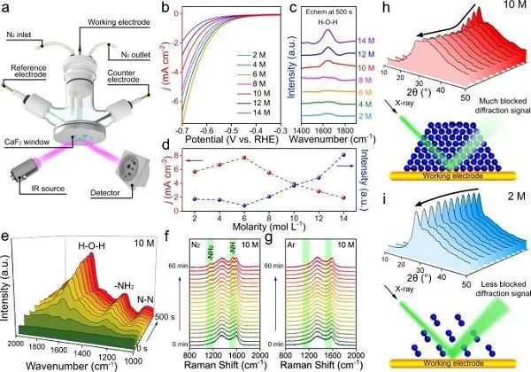 图3 HER性能和原位表征:(a)用于原位FTIR表征的特制电解池;(b)饱和Ar环境下不同体系的LSV曲线;(c)在-0.3 V下的原位FTIR谱图;(d)HER活性与FTIR谱图中H-O-H弯曲振动强度随锂盐浓度的变化;(e)在-0.3 V下、电解质为10 M LiCl的原位FTIR谱图随时间变化;(f,g)在-0.3 V下、含饱和N2或饱和Ar的10 M LiCl的原位拉曼光谱随时间变化;(h,i) 在-0.3 V下、以10 M或2 M LiCl为电解液的原位XRD图与相应的机理。