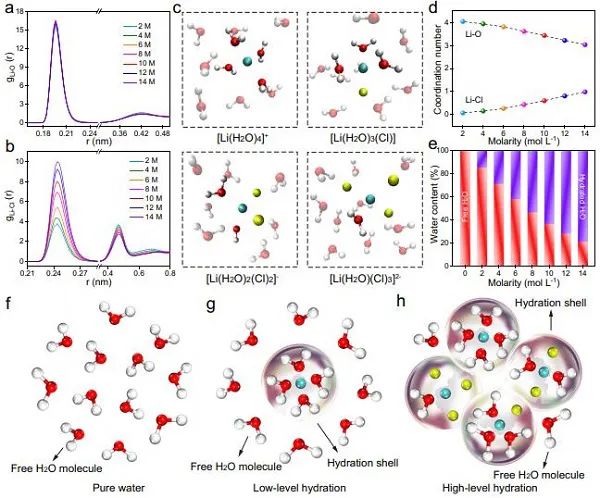 图1 水合作用体系的分子动力学模拟:(a)Li+-O、(b)Li+-Cl−相互作用的径向分布函数;(c) Li水合结构在四种稳定团簇中保持平衡;(d)Li+-O和Li+-Cl–的配位数随LiCl浓度的变化;(e)不同浓度LiCl溶液中的含水量;(f-h)水合壳在纯水、低水合体系以及高水合体系中的示意图。