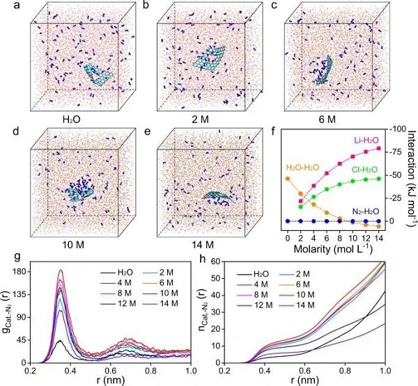 基于上述结果,可以认为LiCl是诱发盐析效应的理想溶质。因此,作者随后研究了LiCl对多相催化体系的影响。不同锂盐浓度的快照如图2a-e所示。显然,与纯水相比,高浓度溶液中电解质/电催化剂界面处存在N2富集现象。通过计算了体系内的一些相互作用,以探索潜在的机制,如图2f所示,在纯水中,只存在H2O-H2O相互作用和弱的N2-H2O相互作用。N2分子保持动态平衡状态,在氢键网络中均匀分布,没有形成局部浓度差。在LiCl溶液中,Li+、Cl–和N2分子均与H2O分子相互作用。由于N2具有微小的四极矩,它对H2O的亲和力总是最低的。另一方面,在2-14 M LiCl溶液中,Li+-H2O相互作用和Cl–-H2O相互作用都更加强烈。