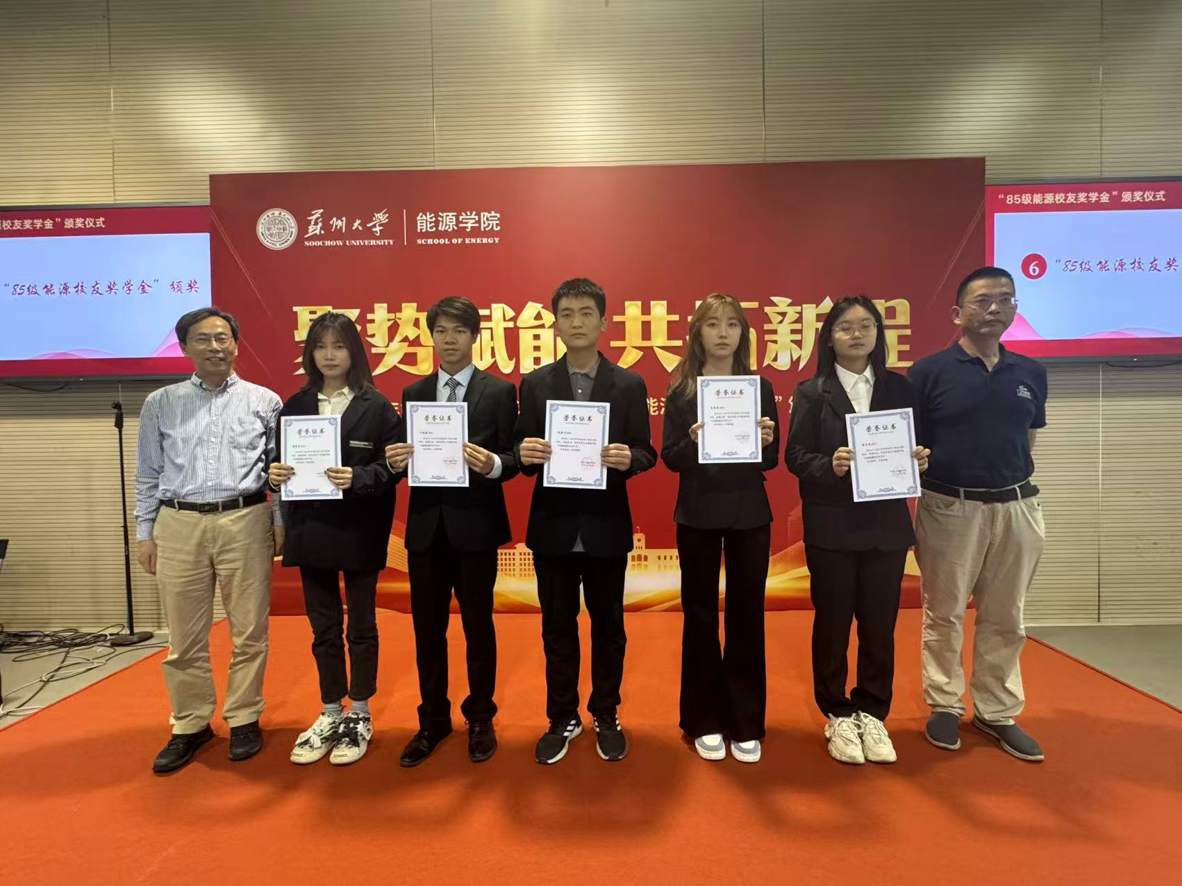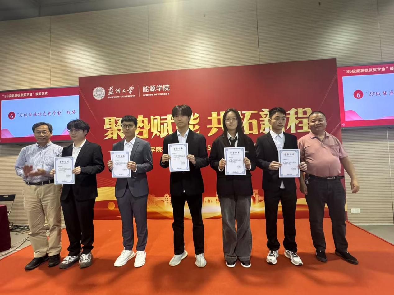 学院党委书记严冬生与89届校友何印、陈国新、刘骥共同为获奖学生颁奖并合影留念。