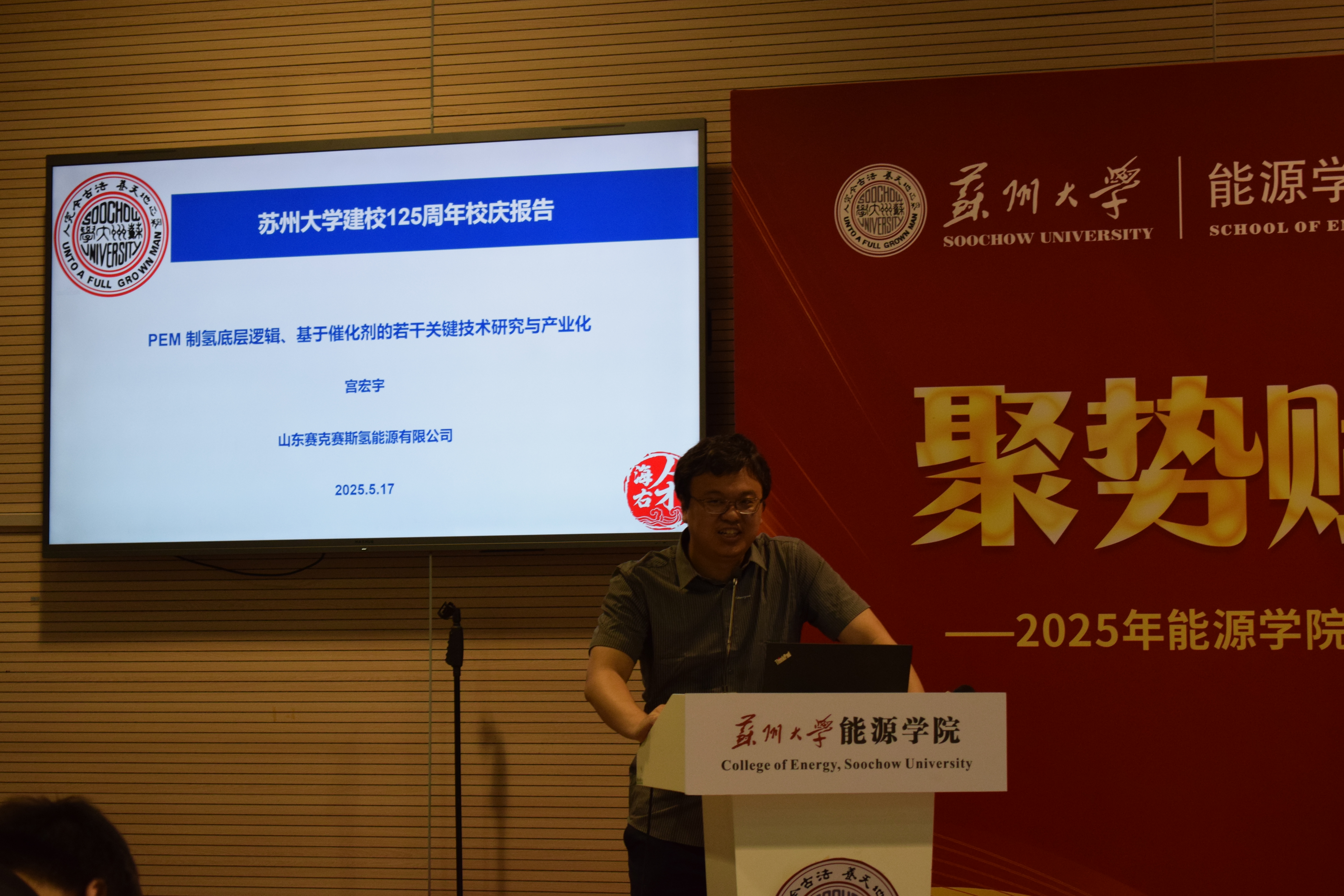2018届校友、山东赛克赛斯氢能源有限公司研发总监宫宏宇带来“PEM制氢底层逻辑、基于催化剂的若干关键技术研究与产业化”的专题报告,结合行业前沿技术,解析了新能源领域的创新路径与产业化实践,拓宽了师生的专业视野。