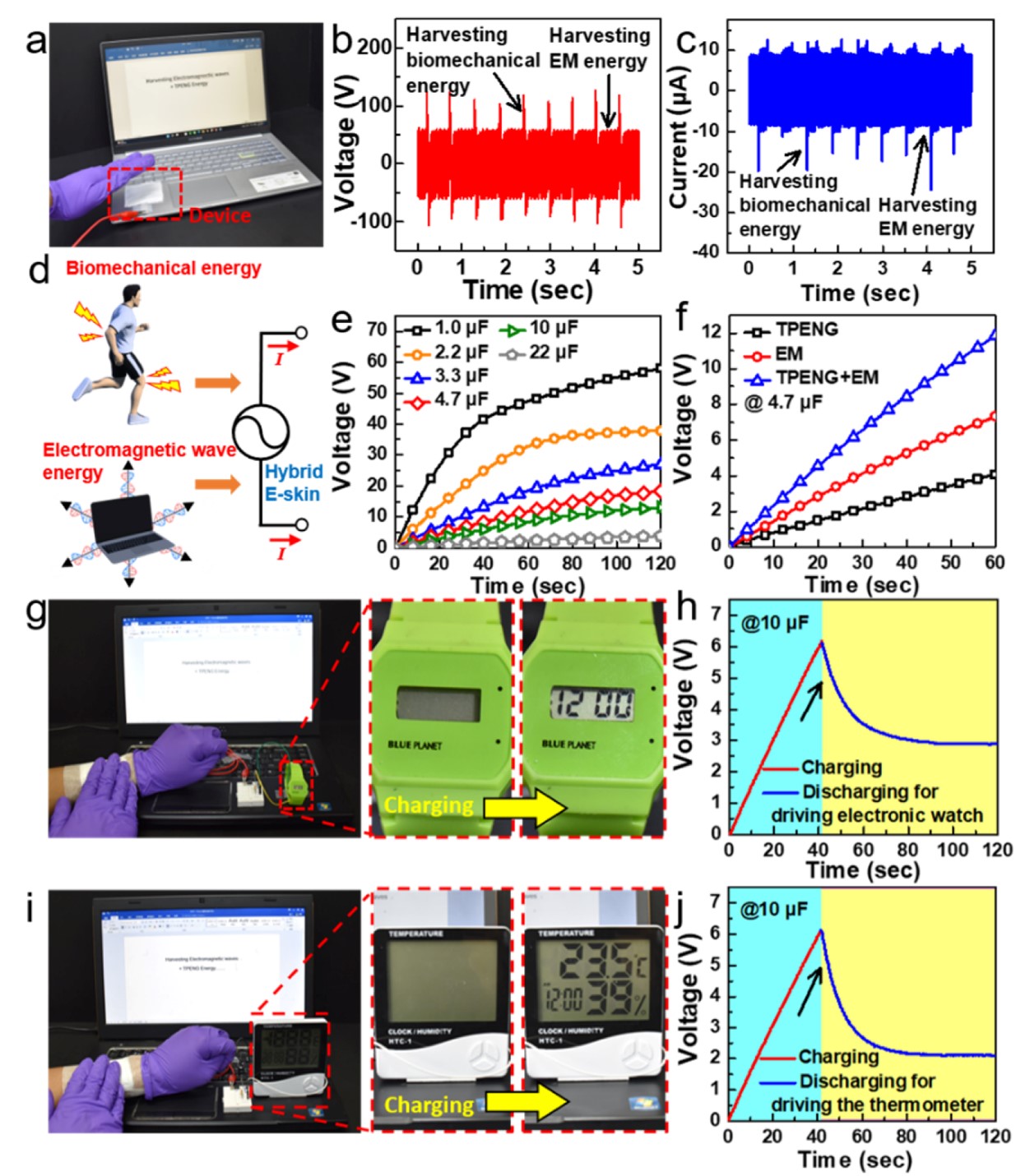 图2:TPEG-skin在收集生物机械能和电磁能时的性能表现。a.TPEG-skin贴在笔记本电脑上的照片,通过手触收集生物机械能,并从正在操作的笔记本电脑中收集电磁能。b.输出电压和c.通过收集混合能量源输出的电流。d.TPEG-skin将混合的生物机械能和电磁能转化为交流电的示意图。e.TPEG-skin在不同电容容量下的充电性能。f.单独的TPENG、EMNG和混合TPEG-skin对4.7微法电容的充电性能比较。g.展示从手触和笔记本电脑中收集能量为电子手表供电,以及h.实时充放电曲线。i.展示从手触和笔记本电脑中收集能量驱动温湿度计的过程,以及j.实时充放电曲线。(a、g和i中的样品尺寸均为5 × 5 cm²)。