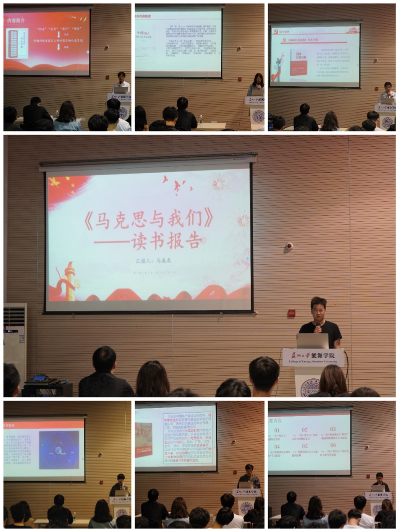 第二部分由读书会七个读书小组进行读书成果展示。第一小组同学主讲《马克思与我们》,从内容简介、书籍特点、实践感悟方面,生动再现了新时代中“马克思与我们的时代观”等书中精彩观点。第二组学员用生动的文字与图片材料介绍了《百名院士的红色情缘》中动人的红色故事,并由此回望中国科技发展史上那些坚卓深邃的红色足迹,激励在座的各位学员们继续勇对挑战、迎难而上,坚定理想信念、强化担当作为,将红色精神发扬光大。第三组同学代表基于《品味红色经典》一书,讲述了红色经典产生之后的作用与功能、影响与意义,通过展示小组成员的学习感悟,表达了成员们对本书的敬意与珍重。第四组学员围绕《中国北斗》一书中作者、创作背景、内容以及特点等方面,着重介绍了几十年来探索中国卫星导航的全球化崛起之路,诠释了“自主创新、开放融合、万众一心、追求卓越”的新时代北斗精神。第五组《平语近人》小组主要通过读书共建剪影与展示成员感悟的方式介绍该书中习近平总书记治国理政的思想以及其中的古典风韵。第六组成员通过简述《建军大业》中中国人民解放军从自建、成长到强大的历史背景与来龙去脉,歌颂了老一辈军人革命家等人的伟大付出,鼓舞新一辈共产党人永葆为民初心、赤诚奉献,赞美了中国共产党的奋斗与荣光。第七组围绕书目《<共产党宣言>导读》,从理论背景、历史意义与当代价值展开了讨论,分享了他们在阅读之后对于马克思主义以及马克思主义中国化的新认识。