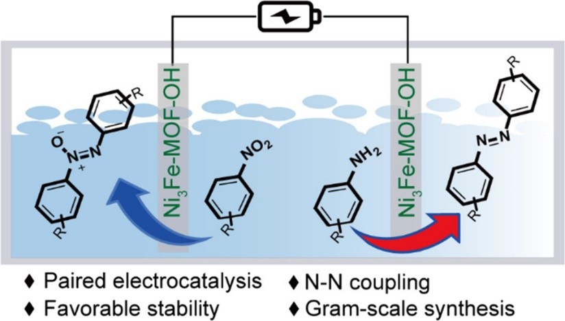 近日,苏韧课题组在ACS catalysis上发表题为“Paired Electrochemical N−N Coupling Employing a Surface-Hydroxylated Ni3Fe-MOF-OH Bifunctional Electrocatalyst with Enhanced Adsorption of Nitroarenes and Anilines”的研究工作。