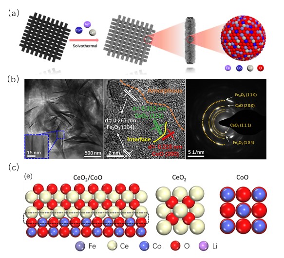 近日,秀人网 杨瑞枝教授课题组通过引入晶格匹配效应,采用一步溶剂热法成功制备了具有非晶/晶体异质结构的三元金属氧化物(CoFeCeOx)自支撑电极。通过对Co,Fe和Ce比例的精准调控,获得具有热力学和动力学稳定的高活性CoFeCeOx正极催化剂,在锂-氧气电池中表现出优异的电化学性能。系统实验研究并结合密度泛函理论(DFT)分析,揭示了氧化物组分之间最小的晶格失配和不同元素间的协同电子作用有效调控了充放电过程中对中间产物LiO2的吸脱附。