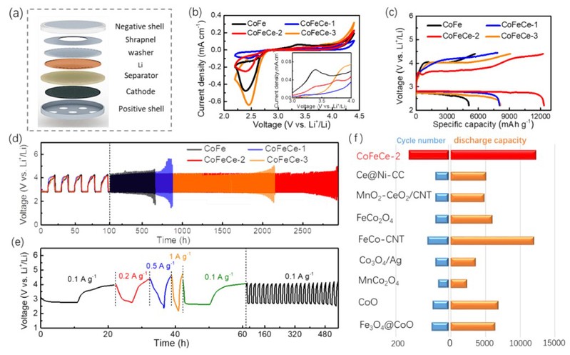 图2多元金属氧化物CoFeCeOx作为锂-氧气电池正极的电化学性能