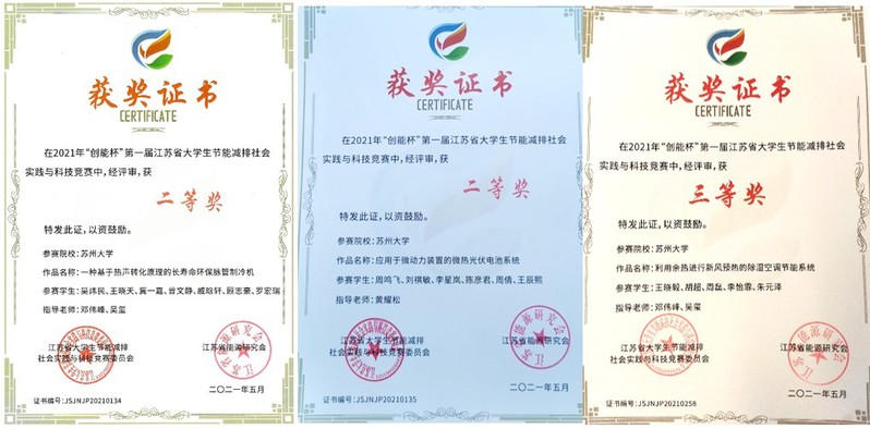 为备战此次竞赛,我院作为组织单位,先后多次举办专家评审会,邀请了我院经验丰富的专家吴玺、吴世凤、黄耀松、邓伟峰等老师在项目选拔、申报书撰写、项目展示、现场答辩等各个环节,给予各团队悉心指导。最终,由我院教师邓伟峰、吴玺指导,吴炜民等7名学生组成的团队共同完成的“一种基于热声转化原理的长寿命环保脉管制冷机”作品获二等奖;由我院教师黄耀松指导,周鸣飞等6名学生组成的团队共同完成的“应用于微动力装置的微热光伏电池系统”作品获二等奖;由我院教师邓伟峰、吴玺指导,王晓毅等5名学生组成的团队共同完成的“利用余热进行新风预热的除湿空调节能系统”作品获三等奖。参赛师生积极备赛,对项目作品精心雕琢,充分展现了我院师生积极进取、大胆创新的竞赛风貌。