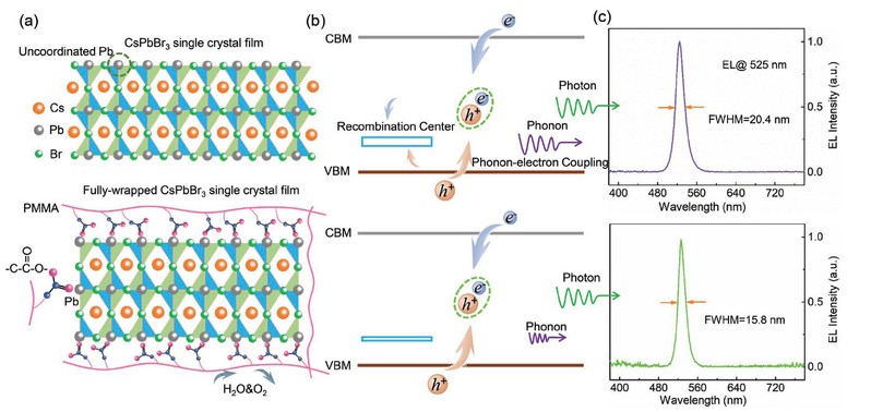 我们采用了一种新的钙钛矿薄膜表面钝化方法 (图1),即采用甲基丙烯酸甲酯 (PMMA) 完全包裹钙钛矿CsPbBr3单晶薄膜的方法来抑制表面缺陷。研究结果表明,作为钝化层的超薄 PMMA 层可以显著提高载流子寿命并抑制表面缺陷。通过采用自支撑单晶钙钛矿薄膜进行钝化,研究团队成功地构建了垂直 LED 器件,避免了 LED 器件的边缘发光和短路等问题。