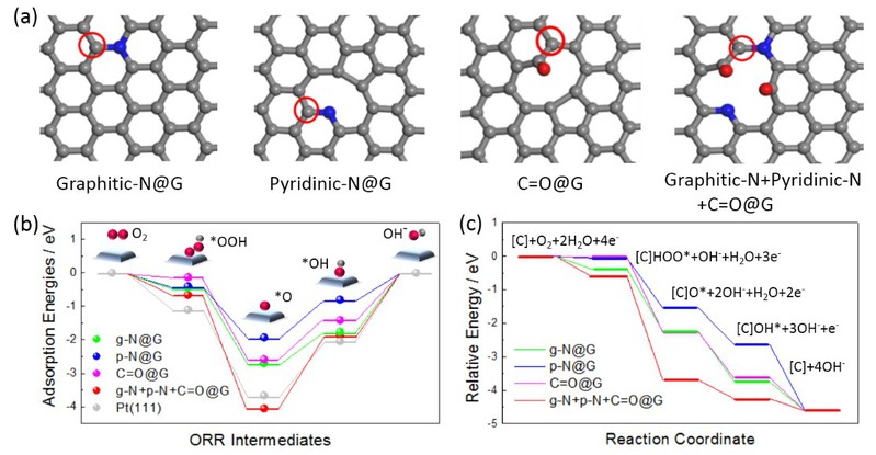 DFT理论计算揭示了三维石墨烯的石墨氮、吡啶氮和C=O基团在ORR和OER中的关键作用(图4)。得益于异原子N和O在石墨烯结构缺陷边缘上的有效掺杂以及形成的丰富活性位点,氧气及反应中间体(O2, *OOH,*O和*OH)在NO-G@CP上的吸附能非常接近于Pt(111),从而表现出高的催化活性。