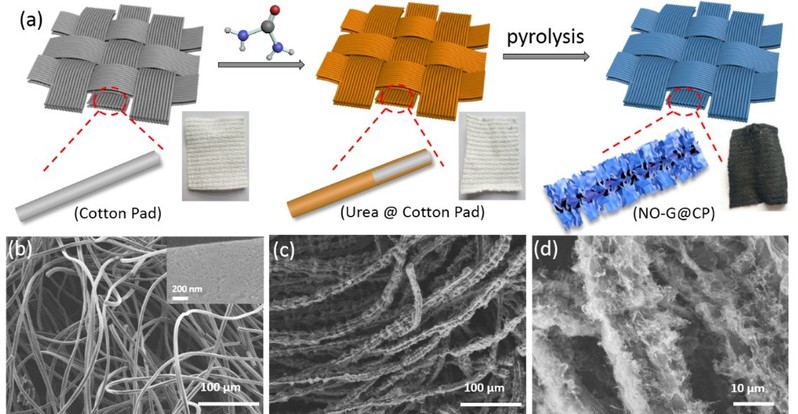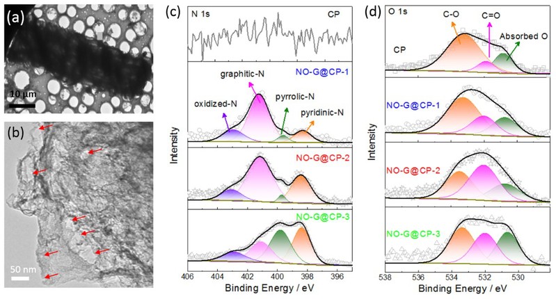 本工作以尿素作为碳源,化妆棉为基底,合成了柔性三维(3D)N掺杂、富O官能团的石墨烯全碳空气电极(NO-G@CP)(图2)。这种3D柔性网络体系结构有利于电子传输、气体扩散和电解质渗透。柔性电极的每根纤维都是由3D石墨烯片组成,以高温热解法制备的石墨烯片边缘的结构缺陷促进了异原子N和O的有效掺杂(图3),在ORR/OER过程中有效促进了氧气及其中间体的吸附和反应。