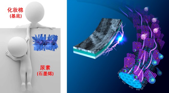 一体化电极的制备是柔性器件的关键,商用碳布和不锈钢网等是常用的基底。本工作采用生活中常见的化妆棉作为制备石墨烯柔性一体化电极的碳源和基底(图1)。