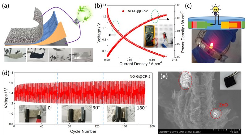 NO-G@CP材料保持了源于化妆棉的碳纤维网络结构和柔性特质,可被直接用作柔性锌-空气电池的正极(图5)。该柔性电池的最大功率密度为65.1 mW cm-2,可叠加组装在塑料手环上为LED灯供电。在各种弯曲角度下,电池可以稳定循环超过180圈,具有极小的充放电电势差(< 0.46 V)。