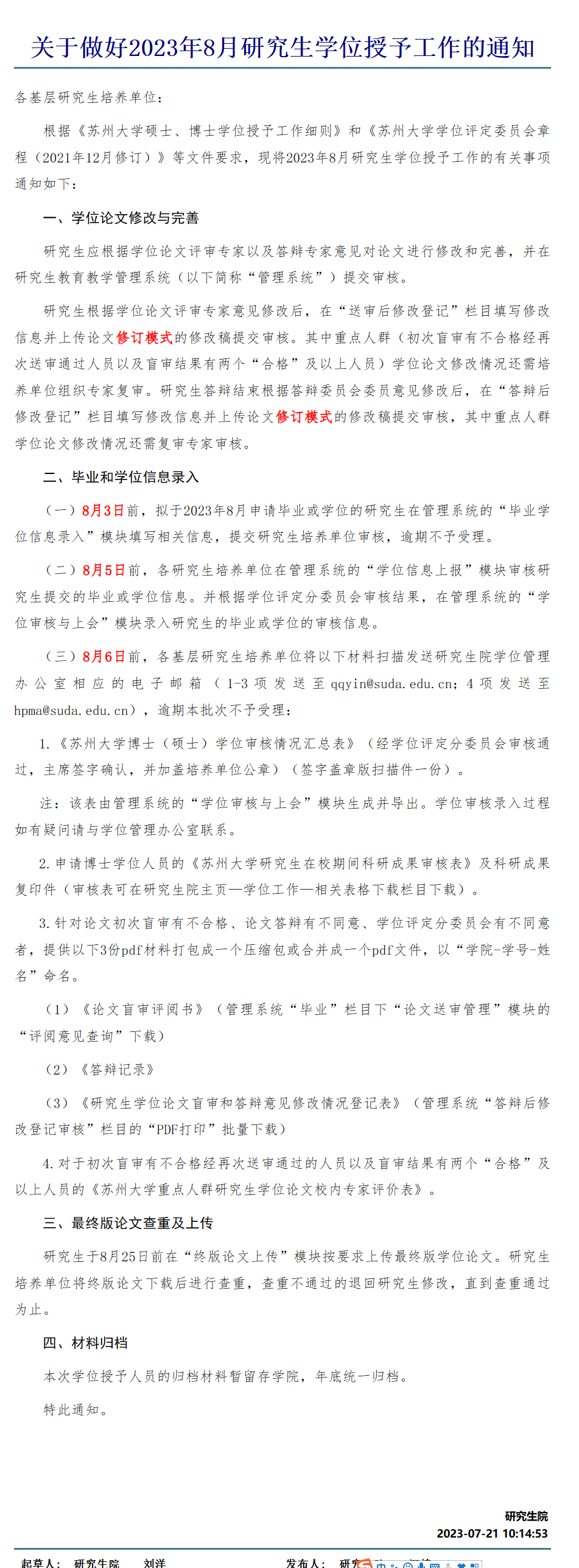 一、根据学校通知《关于做好2023年8月研究生学位授予工作的通知》//file.xiurenmodel.com/defaultroot/gov/info_view_my.jsp?whir_new_verifyCode=1&editId=36081752,请以下同学根据通知做好通知中要求的工作。