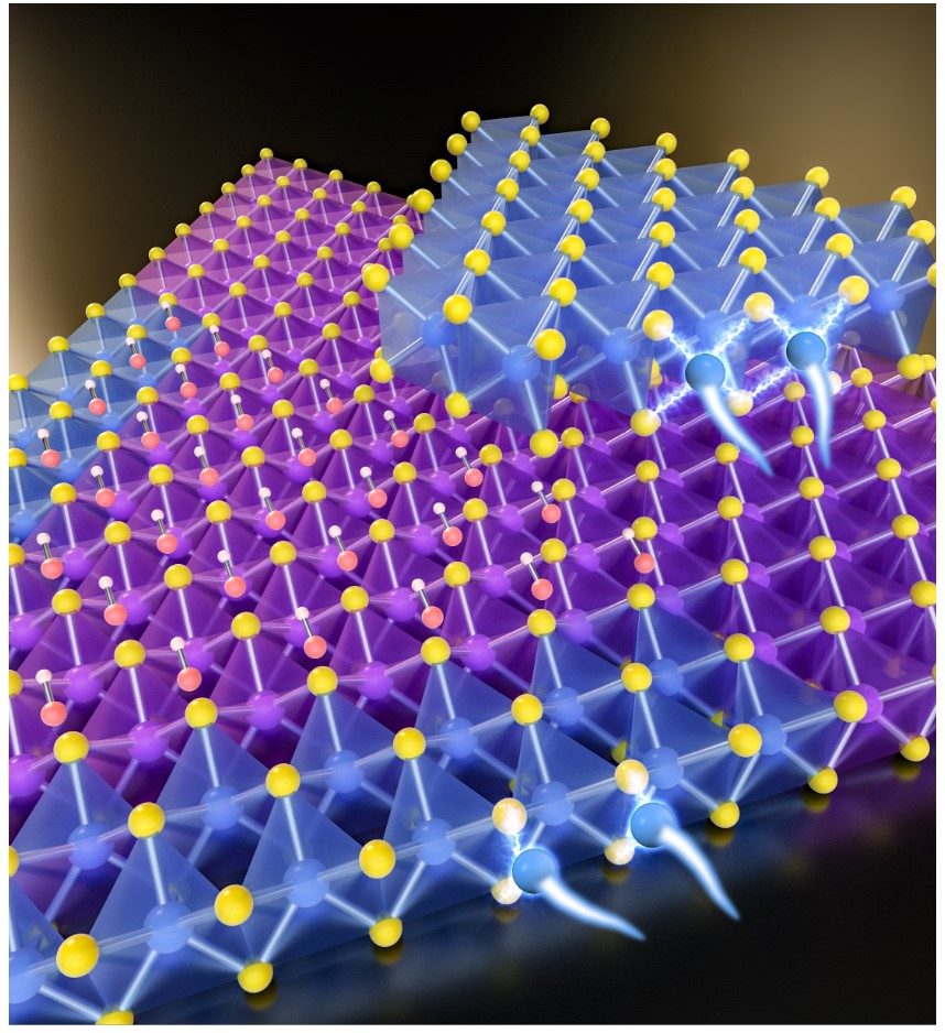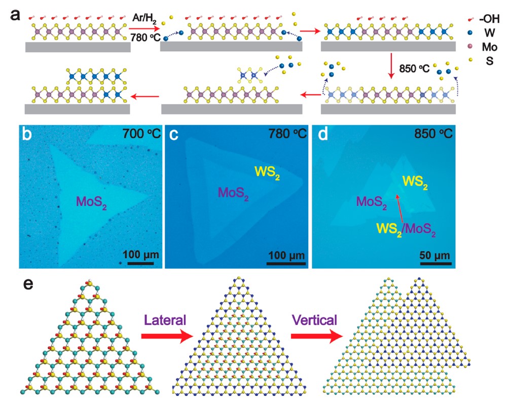 图1. 借助OH-选择性生长WS2/MoS2横向和垂直异质结。
