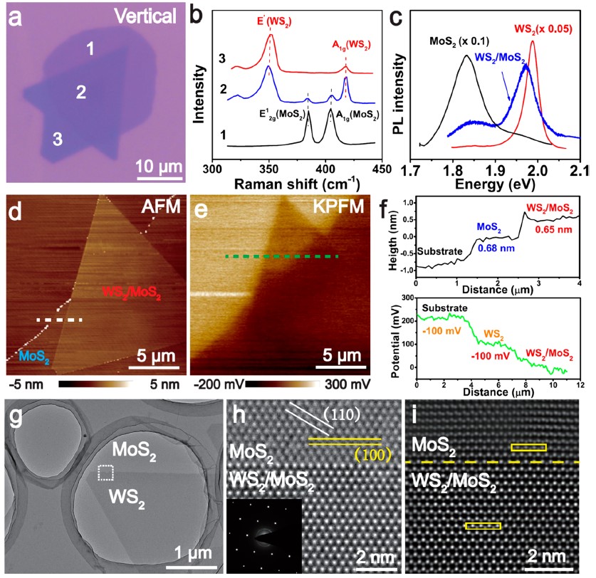 图3. (a)堆垛的垂直异质结的光学显微镜图像。(b&c)相应的拉曼光谱和PL光谱。(d&e)垂直异质结的AFM和KPFM图像。(f)高度轮廓。(g)WS2/MoS2垂直异质结的低倍TEM图像。(h&i)MoS2与WS2/MoS2之间界面的HRTEM和HAADF-STEM图像。