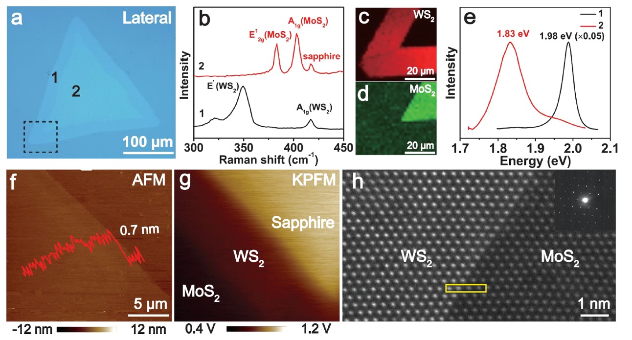 图2. (a)三角形横向异质结晶体的光学显微镜图像。(b&e)拉曼光谱和PL光谱。(c&d)WS2和MoS2的相应拉曼成像。(f)横向异质结的AFM图像。(g)KPFM图像。(h)WS2和MoS2晶畴之间界面的原子分辨HAADF-STEM图像。