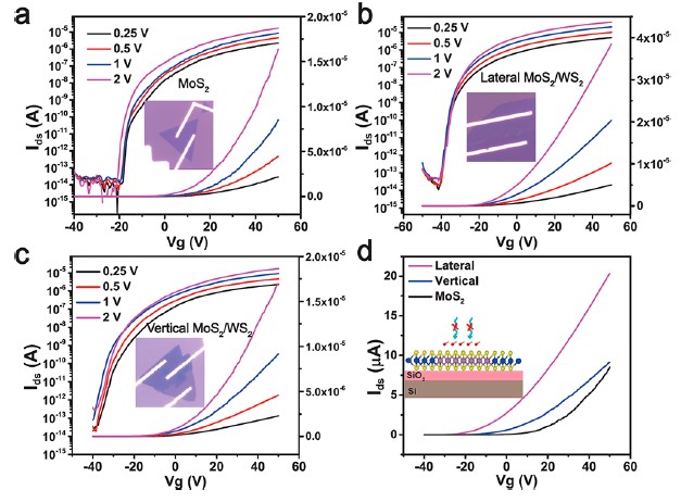 图5. (a-c)MoS2-OH,WS2/MoS2横向异质结和WS2/MoS2垂直异质结的转移特性。(d)三个器件在相同偏置电压(1 V)下的转移曲线