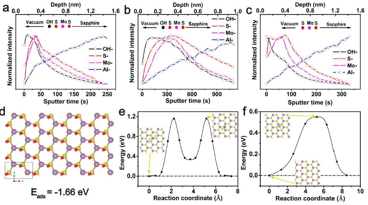图4. (a)归一化的ToF-SIMS深度轮廓。(b&c)WS2/MoS2横向异质结和WS2/MoS2垂直异质结。(d)MoS2-OH的全覆盖吸附构型的优化结构,所计算的氢氧化物分子的吸附能为-1.66 eV。(e, f)吸附的W1S1和W1S2团簇在MoS2表面上的扩散反应。