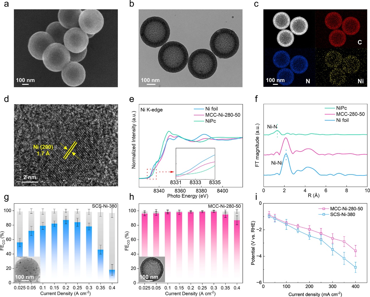 本研究所采用的Ni负载多孔碳纳米笼模型催化剂为MCC-Ni-x-y,其中x和y分别表示空腔内径和壳层厚度。如图Scheme 1b所示,该催化剂通过硬模板法合成,内径x可通过调控SiO2模板的尺寸控制,而壳层厚度y则由表面聚合过程中单体的浓度决定。随后,在去除碳化树脂涂层中的多余SiO2后,形成壳壁上的介孔结构,并通过氮锚定法将Ni活性位点引入至催化体系中。