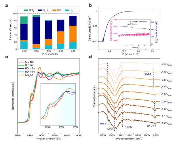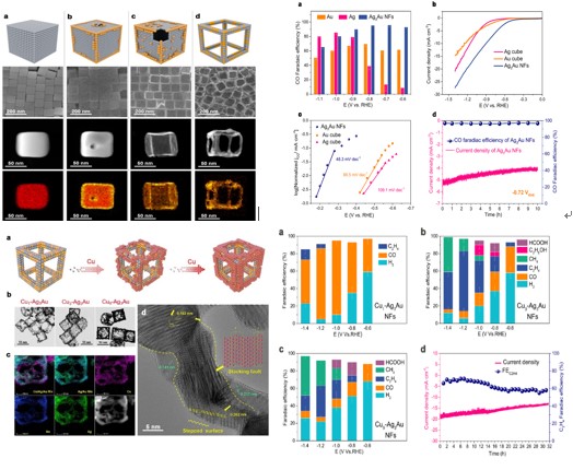 综合上述,利用三元催化剂以分别调控CO2RR中CO生成和C-C偶联的两个步骤,其中前者是通过合金化的Ag/Au基底高选择性获得,而后者则是通过高应变和缺陷丰富的Cu高效实现。同时构建的催化剂的纳米框架结构对于活性位点的暴露以及离子、气体的质量传输具有极大促进作用。最终通过整合串联效应,电子调制,缺陷工程和开放骨架结构设计,打破了CO2RR中间体线性比例关系,从而改善C2H4的选择性。