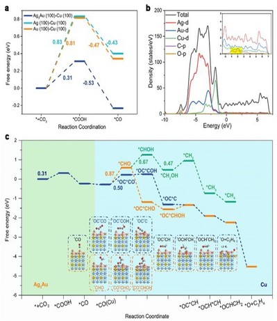 通过原位 XAFS来检查Cu的价态随电催化时间的变化、原位衰减全反射表面增强红外吸收光谱(ATR-SEIRAS)来监测在CO2饱和的0.1 M KHCO3中在从 -0.4到 -1.2 VRHE的电位下,催化剂表面吸附中间体的演变。发现在整个测试期间,Cu3-Ag3Au NFs中仍存在结构诱导的Cud+(0 < d <1)。在ATR-SEIRAS测试中, CO的峰先增大后减小,同时,该峰显示出随着电压的增加而出现蓝移,认为这是CO与金属基质之间的强烈电子相互作用而导致的Stark位移。另外,在1725 cm-1处的特征峰强度随着施加电压的增大而增加,这个位置与吸附的*CHO的伸缩振动峰位置非常接近。1563 cm-1处的特征峰随着电势的降低而显着增长,这个峰是*OCCOH的C-O振动特征峰,这是CO-CO二聚形成C2H4的有力证据。利用DTF计算了电催化CO2RR过程中形成C2H4的反应能垒。其中计算清楚地表明,CO从Ag3Au溢流到Cu上在热力学上是有利的,并且*CO-*CO偶联反应和*CO→*CHO加氢步骤都是决定乙烯生成的关键步骤。