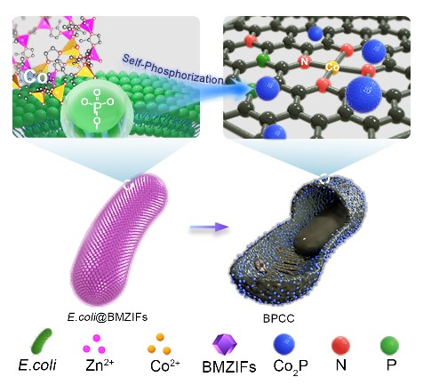 通过在大肠杆菌表面原位组装MOF材料,开发出一种具有“自磷化”机制的细菌模板法来构筑表面锚定金属磷化物的多级多孔碳胶囊的新策略。选用极易在实验室进行培养繁殖的阴性革兰氏大肠杆菌作为模板,借助于细菌表面丰富的有机物和有机官能团以及其本身呈负电的性质,吸引MOF前驱体中的配体和金属离子在细菌表面富集。原位生长的MOF如铠甲一般包覆在细菌外层,完美拷贝生物模板的形态。与此同时,大肠杆菌细胞膜中含有的磷在高温裂解的过程中,与MOF中的钴自发反应生成磷化二钴纳米颗粒,产生额外的异原子掺杂以及电化学活性位点。碳胶囊凭借其多级多孔结构、异原子掺杂、丰富的Co-N-C基团以及表面锚定的Co2P纳米颗粒,作为锂硫电池储硫载体以及锌空电池催化剂的应用中表现出了优异的电化学性能。硫与N、P掺杂碳以及极性Co2P之间通过强化学相互作用极大地抑制了多硫化物的穿梭,而碳胶囊表面的主要活性位点有效地促进了ORR和OER。该工作创新性地将微生物与MOF材料相结合,开发出自磷化机制,为新型碳基复合材料的合成设计开辟了一条新的途径,并证明了其在能源转化与存储方面巨大的应用潜力。