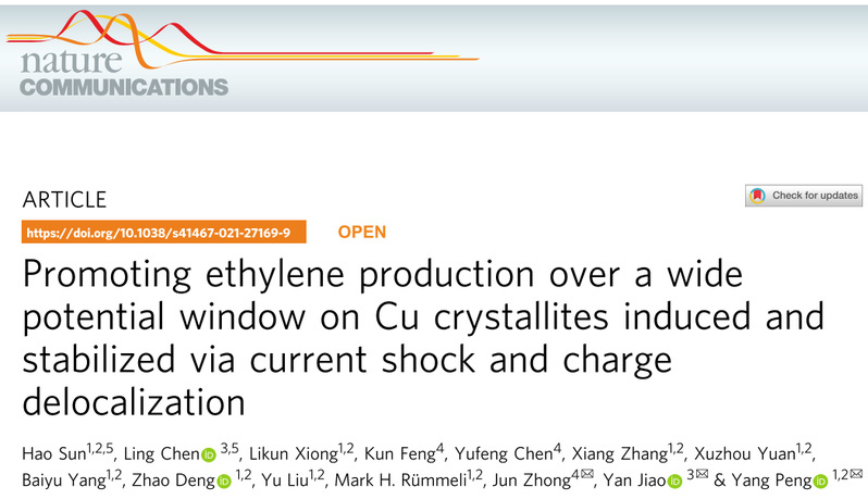 近日,秀人网 彭扬课题组与合作者团队(钟俊、焦研教授)详细研究了导电载体对导电MOF-Cu3(HITP)2的CO2RR性能的影响,在Nature Communications上发表题为“Promoting ethylene production over a wide potential window on Cu crystallites induced and stabilized via current shock and charge delocalization”的观点文章。 秀人网 博士生孙浩为第一作者、澳大利亚陈凌博士为共同一作。
