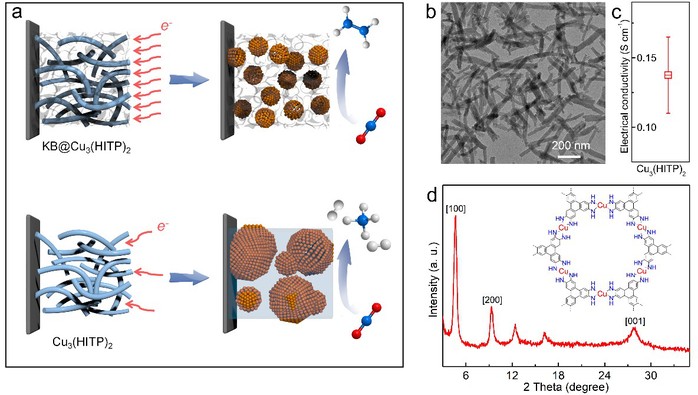 图3. (a) KB@Cu3(HITP)2和 (b) Cu3(HITP)2催化反应后的球差TEM图片;(c, d and e)DFT计算。