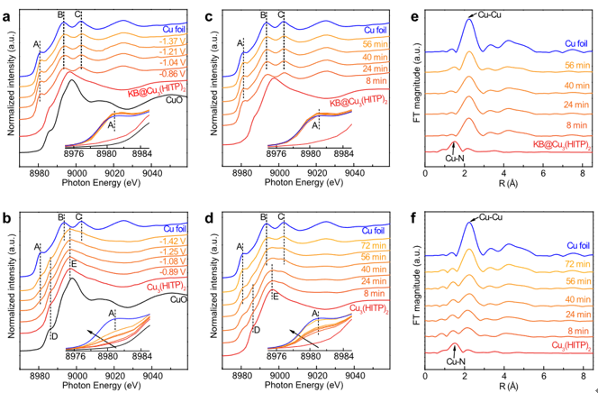 图2. (a, c and e) KB@Cu3(HITP)2的原位XAS;(b, d and f) Cu3(HITP)2的原位XAS。