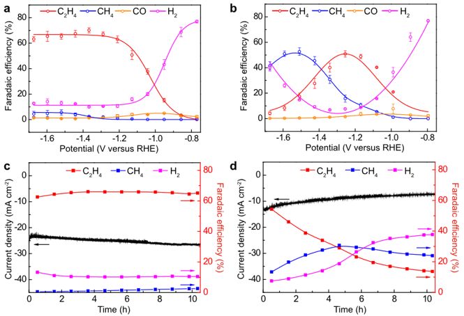 图1. (a) KB@Cu3(HITP)2 与 (b) Cu3(HITP)2的CO2RR选择性;(c) KB@Cu3(HITP)2 与 (d) Cu3(HITP)2的CO2RR选择性。