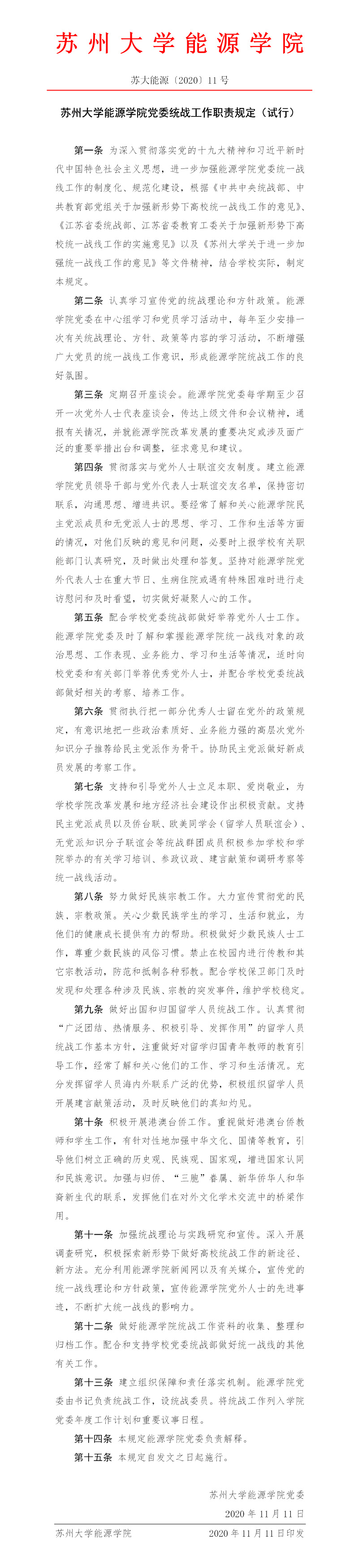 秀人网 党委统战工作职责规定(试行) 苏大能源〔2020〕11号