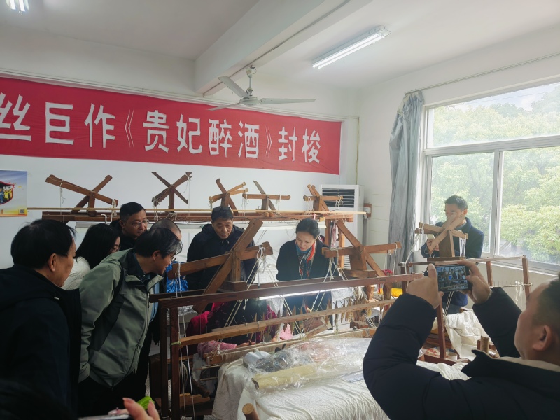 随后,一行人前往以传统缂丝工艺著称的仁和织绣工艺品有限公司。在公司负责人的引领下,党员们首先前往车间亲眼目睹了缂丝艺人巧夺天工的制作过程。每一根丝线在艺人的手中仿佛有了生命,交织出一幅幅精美绝伦的艺术品,大家纷纷感叹作为非遗文化的缂丝工艺无愧是中国传统文化的瑰宝。继而,公司负责人详细介绍了公司的发展历程、荣耀时刻和未来展望。从最初的小作坊到如今享誉国内外的知名企业,仁和织绣始终坚守传统工艺,不断创新发展,为传承和弘扬缂丝文化做出了积极贡献。负责人还表示,公司将继续致力于缂丝工艺的传承与创新,让这一古老艺术在现代社会中焕发出新的生机与活力。