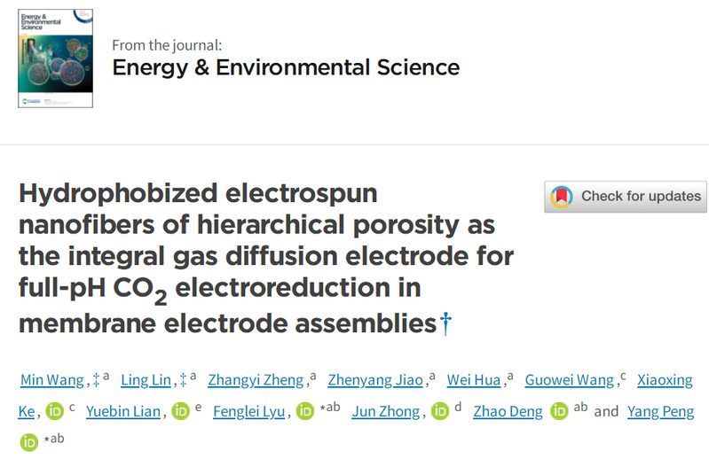位于潮湿的江南,纺丝的难度比较大,用彭扬学生的话就是纺丝要靠天吃饭,过程犹如孵小鸡一样,时间、温度、耐心甚至爱心样样都要有。 另一方面,在一体化电极基础上组装膜电极组件,既是体力活也是技术活,需要大量的时间成本。 她继续说道:“记得那是 2022 年春节,那时还是疫情期间,进校、留校的审批都很严格。快放假的时候膜电极组件运行了将近100个小时,又正巧碰上停电,后来历经一次又一次的失败,我们才逐步运行到近 300小时。那段时间真是又忐忑又惊喜、痛并快乐着。” “所谓慢工出细活,这极大锻炼了这两位学生耐心,也通过这个工作提升了他们的自信心。”彭扬说。 最终,相关论文以《具有分级孔隙率的疏水化电纺纳米纤维作为整体气体扩散电极用于膜电极组件中的全pH CO2电还原》(Hydrophobized electrospun nanofibers of hierarchical porosity as the integral gas diffusion electrode for full-pH CO2 electroreduction in membrane electrode assemblies)为题发在 Energy & Environmental Science[3],WangMin 和 LinLing 是共同一作,彭扬担任通讯作者。 图 | 相关论文(来源:Energy & Environmental Science) 另据悉,目前实验室里测试的电极相对较小(5cm2),稳定性大约为 300 小时,距离商业化应用还有一定距离。 后续,该团队希望能在一体化电极的基础上,组装大面积膜电极组建或膜电极组件电堆(例如组装单片面积为 100cm2),以尝试解决膜电极组件电堆中的工程放大问题,从而实现绿色一氧化碳/合成气的高效、稳定的制备。 在此基础上,他们也将利用二氧化碳电解产生的绿色一氧化碳/合成气,通过电/热催化的方式,将合成气转化为绿色甲醇和高值 C2+ 产物等。同时,课题组也将积极拓展与相关企业的合作。