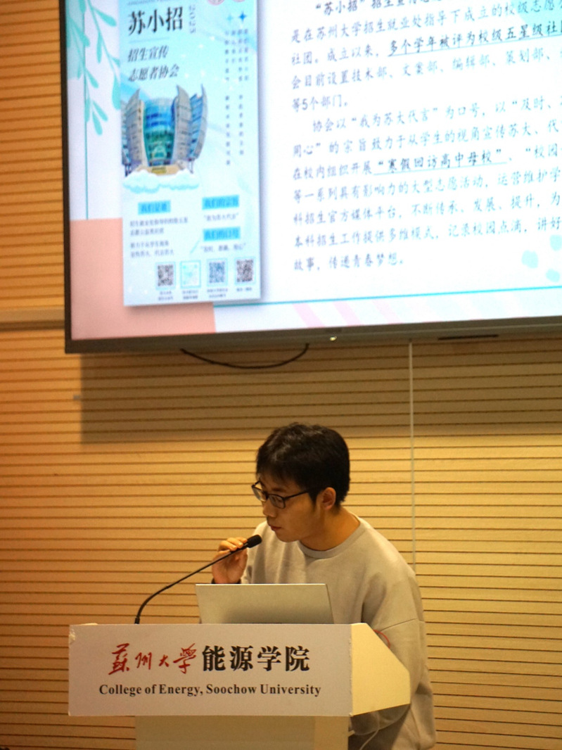 “苏小招”学生代表钟学辉向大家介绍了“苏小招”招生志愿者协会的基本情况,并鼓励大家在寒假积极参与回访高中母校的活动。向高三考生讲述苏大故事,以期为苏大注入更多的新鲜血液。