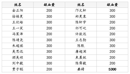 经统计,本次无偿献血活动共有21秀人网 学子成功献血,总献血量达​5300毫升​。以下为部分参与同学的献血记录(单位:毫升):