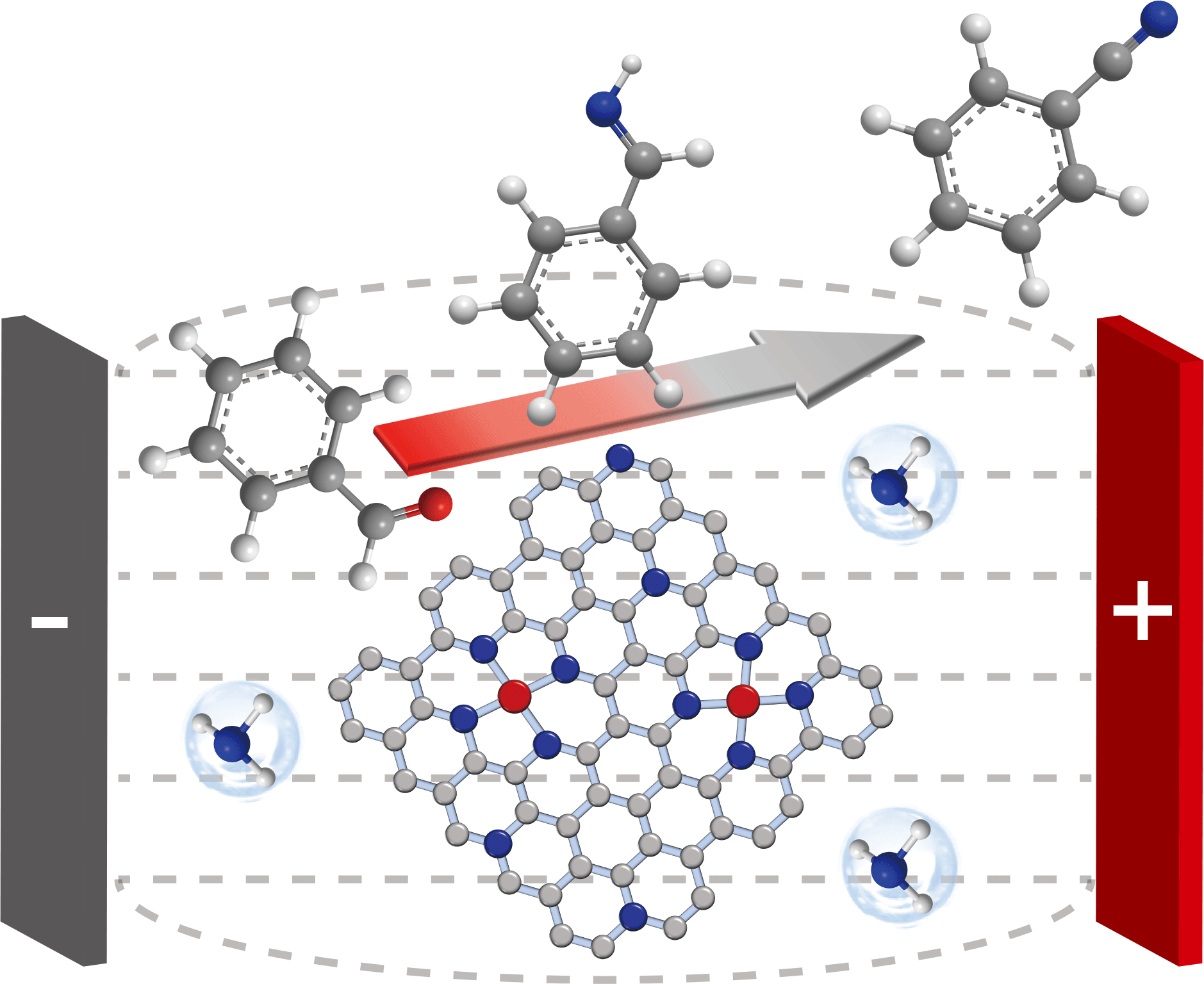 本论文报道了外电场结合铁团簇催化剂(Fe/NC)实现常温常压下氨氧化高效合成腈的系统。研究表明外电场和Fe/NC催化剂协同促进了氨的活化和亚胺中间体的脱氢速率,并能够有效抑制亚胺反向水解成醛。该电场增强的氨氧化系统能够在2 V外电场下将一系列醛类化合物与氨水反应合成对应的腈类化合物,具有良好的稳定性。